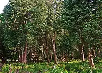 Son bois brun-clair, dur, épais, lourd et résistant, est utilisé dans la construction de maisons rurales.