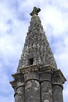 Les colonnes sont surmontées de huit assises en retrait, formant des chapiteaux sans sculpture, le tout est couronné d'un clocheton conique surmonté d'une boule, qui supporte une croix. Ce cône est recouvert de pierres triangulaires en écaille de pomme de pin, pierres qui étaient de petites pierres plates calcaires, des platins[1]. Il est percé à sa base de quatre petites fenêtres rectangulaires, une à l'aplomb de chaque grosse colonne, destinées à laisser rayonner autour de l'édifice la lumière du fanal. Vers le milieu du cône, on voit une cinquième ouverture, plus petite que les précédentes, destinée à laisser échapper la fumée[3].