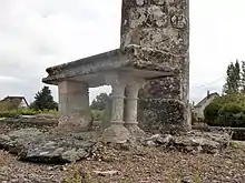 Une structure composée de supports latéraux, dont deux colonnettes, et d'une table gravée d'une croix de Malte — c'est peut-être le remploi d'une pierre tombale[4] —, se trouve à la base de la colonne[1]. Il peut s'agir d'un autel ou d'une pierre d'attente des morts, destinée à supporter un cercueil pendant la cérémonie précédant l'inhumation[5]. Comme l'église et la chapelle Saint-Blaise de Truyes, le monument est probablement intégré au parcours de processions monastiques[6].