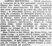 - Jean-Marie Pichon[Note 20], vétérinaire-guérisseur de métier et lutteur de gouren qui selon un chant traditionnel breton de la région d'Hennebont demeura invaincu pendant 7 ans (champion de Bretagne pendant 10 ans de 1902 à 1911) avant qu'un artilleur ne lui ravisse le titre. Le titre du chant est Pichon e Lovedan (Pichon de Lanvaudan en français).