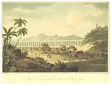 L'Aqueduc Carioca a été construit en 1723 pendant la période du Brésil colonial et avait pour objectif transporter de l'eau de la rivière Carioca au centre-ville. Le travail aiderait à résoudre l'ancien problème de manque d'eau. Études pour amener les eaux de la rivière Carioca à la ville ont commencé dans les premières années du XVIIe siècle, mais les travaux d'installation des conduites d'eau à Rio de Janeiro n'ont commencé qu'un siècle plus tard. Depuis 1896, les Arches de Lapa (Arcos da Lapa) servent de route pittoresque au tramway électrique qui monte la colline Santa Teresa[1].