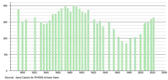 L'évolution du nombre d'habitants est connue à travers les recensements de la population effectués dans la commune depuis 1793. Pour les communes de moins de 10 000 habitants, une enquête de recensement portant sur toute la population est réalisée tous les cinq ans, les populations légales des années intermédiaires étant quant à elles estimées par interpolation ou extrapolation[16]. Pour la commune, le premier recensement exhaustif entrant dans le cadre du nouveau dispositif a été réalisé en 2007[17].