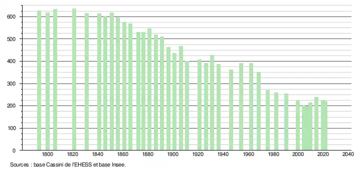 | L'évolution du nombre d'habitants est connue à travers les recensements de la population effectués dans la commune depuis 1793. Pour les communes de moins de 10 000 habitants, une enquête de recensement portant sur toute la population est réalisée tous les cinq ans, les populations légales des années intermédiaires étant quant à elles estimées par interpolation ou extrapolation[23]. Pour la commune, le premier recensement exhaustif entrant dans le cadre du nouveau dispositif a été réalisé en 2004[24]. En 2021, la commune comptait 220 habitants[Note 3], en diminution de 9,09 % par rapport à 2015 (Gers : +0,79 %, France hors Mayotte : +1,84 %). |