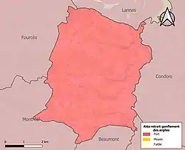 Le retrait-gonflement des sols argileux est susceptible d'engendrer des dommages importants aux bâtiments en cas d’alternance de périodes de sécheresse et de pluie. La totalité de la commune est en aléa moyen ou fort (94,5 % au niveau départemental et 48,5 % au niveau national). Sur les 144 bâtiments dénombrés sur la commune en 2019, 144 sont en aléa moyen ou fort, soit 100 %, à comparer aux 93 % au niveau départemental et 54 % au niveau national. Une cartographie de l'exposition du territoire national au retrait gonflement des sols argileux est disponible sur le site du BRGM[20],[Carte 3].