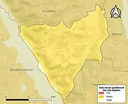 Le retrait-gonflement des sols argileux est susceptible d'engendrer des dommages importants aux bâtiments en cas d’alternance de périodes de sécheresse et de pluie[30]. 98 % de la superficie communale est en aléa moyen ou fort (59 % au niveau départemental et 48,5 % au niveau national)[Carte 5]. Depuis le , en application de la loi ELAN, différentes contraintes s'imposent aux vendeurs, maîtres d'ouvrages ou constructeurs de biens situés dans une zone classée en aléa moyen ou fort[Note 7],[31].