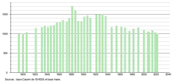 | L'évolution du nombre d'habitants est connue à travers les recensements de la population effectués dans la commune depuis 1793. Pour les communes de moins de 10 000 habitants, une enquête de recensement portant sur toute la population est réalisée tous les cinq ans, les populations légales des années intermédiaires étant quant à elles estimées par interpolation ou extrapolation[26]. Pour la commune, le premier recensement exhaustif entrant dans le cadre du nouveau dispositif a été réalisé en 2008[27]. En 2021, la commune comptait 1 000 habitants[Note 4], en diminution de 8,59 % par rapport à 2015 (Aude : +2,47 %, France hors Mayotte : +1,84 %). |