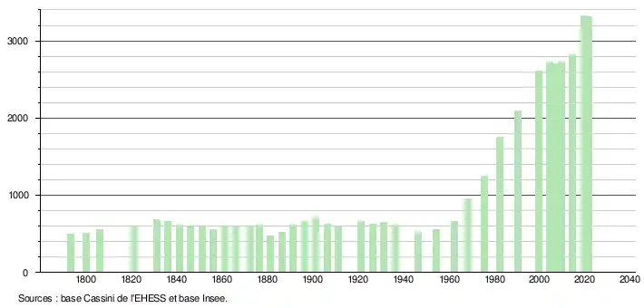L'évolution du nombre d'habitants est connue à travers les recensements de la population effectués dans la commune depuis 1793. Pour les communes de moins de 10 000 habitants, une enquête de recensement portant sur toute la population est réalisée tous les cinq ans, les populations légales des années intermédiaires étant quant à elles estimées par interpolation ou extrapolation[20]. Pour la commune, le premier recensement exhaustif entrant dans le cadre du nouveau dispositif a été réalisé en 2004[21].