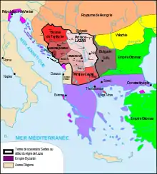 - Lazar gouverne le plus grand territoire, la Serbie Moravienne, qui regroupait les terres serbes du Danube au nord au sud Novo Brdo (ville à 20 km à l'est de Priština), la Drina à l'ouest jusqu'à Niš ;