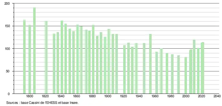 L'évolution du nombre d'habitants est connue à travers les recensements de la population effectués dans la commune depuis 1793. Pour les communes de moins de 10 000 habitants, une enquête de recensement portant sur toute la population est réalisée tous les cinq ans, les populations légales des années intermédiaires étant quant à elles estimées par interpolation ou extrapolation[21]. Pour la commune, le premier recensement exhaustif entrant dans le cadre du nouveau dispositif a été réalisé en 2005[22].