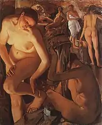 Les figures féminines représentées sont immobiles et dans des positions conventionnelles et l'absence de mouvement donne l'impression d'une panneau mural monumental[33].