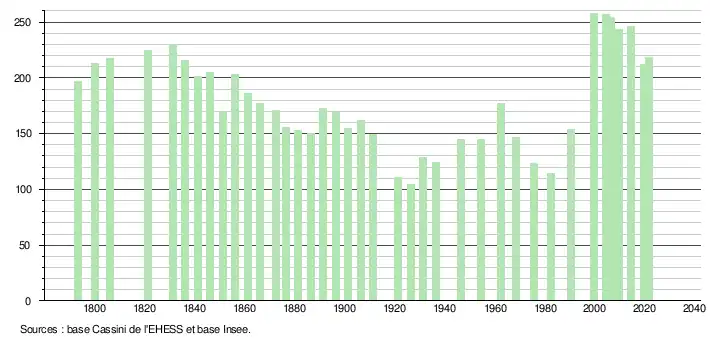 L'évolution du nombre d'habitants est connue à travers les recensements de la population effectués dans la commune depuis 1793. Pour les communes de moins de 10 000 habitants, une enquête de recensement portant sur toute la population est réalisée tous les cinq ans, les populations légales des années intermédiaires étant quant à elles estimées par interpolation ou extrapolation[26]. Pour la commune, le premier recensement exhaustif entrant dans le cadre du nouveau dispositif a été réalisé en 2004[27].