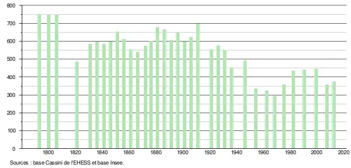 L'évolution du nombre d'habitants est connue à travers les recensements de la population effectués dans la commune depuis 1793. À partir du , les populations légales des communes sont publiées annuellement dans le cadre d'un recensement qui repose désormais sur une collecte d'information annuelle, concernant successivement tous les territoires communaux au cours d'une période de cinq ans. Pour les communes de moins de 10 000 habitants, une enquête de recensement portant sur toute la population est réalisée tous les cinq ans, les populations légales des années intermédiaires étant quant à elles estimées par interpolation ou extrapolation[6]. Pour la commune, le premier recensement exhaustif entrant dans le cadre du nouveau dispositif a été réalisé en 2007[7],[Note 1].