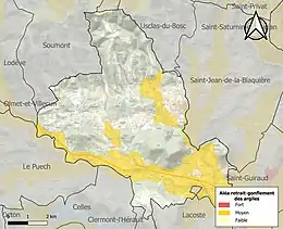 Le retrait-gonflement des sols argileux est susceptible d'engendrer des dommages importants aux bâtiments en cas d’alternance de périodes de sécheresse et de pluie. 28,9 % de la superficie communale est en aléa moyen ou fort (59,3 % au niveau départemental et 48,5 % au niveau national). Sur les 668 bâtiments dénombrés sur la commune en 2019, 324 sont en aléa moyen ou fort, soit 49 %, à comparer aux 85 % au niveau départemental et 54 % au niveau national. Une cartographie de l'exposition du territoire national au retrait gonflement des sols argileux est disponible sur le site du BRGM[25],[Carte 2].