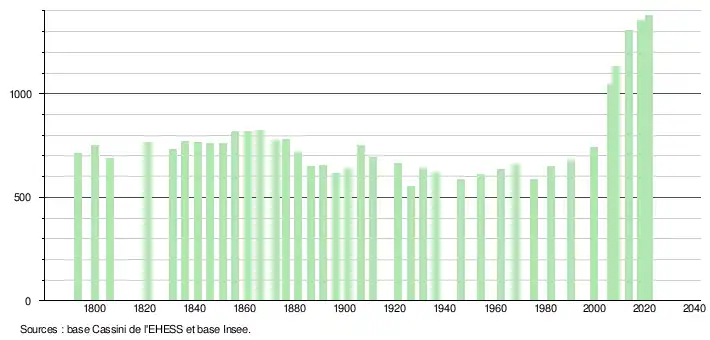 L'évolution du nombre d'habitants est connue à travers les recensements de la population effectués dans la commune depuis 1793. Pour les communes de moins de 10 000 habitants, une enquête de recensement portant sur toute la population est réalisée tous les cinq ans, les populations légales des années intermédiaires étant quant à elles estimées par interpolation ou extrapolation[41]. Pour la commune, le premier recensement exhaustif entrant dans le cadre du nouveau dispositif a été réalisé en 2008[42].