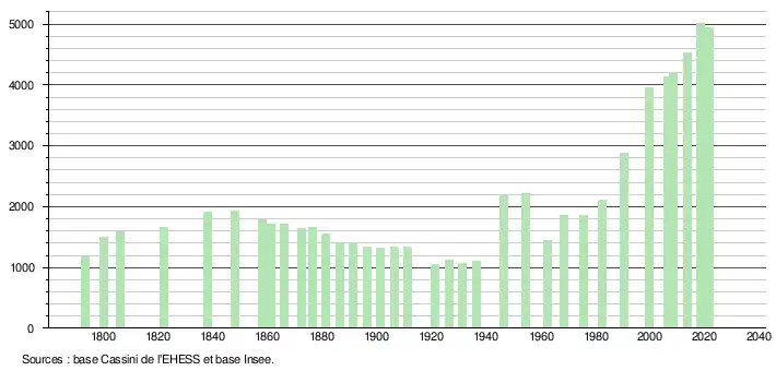 - Population municipale légale en vigueur au 1er janvier 2024, millésimée 2021, définie dans les limites territoriales en vigueur au 1er janvier 2023, date de référence statistique : 1er janvier 2021.