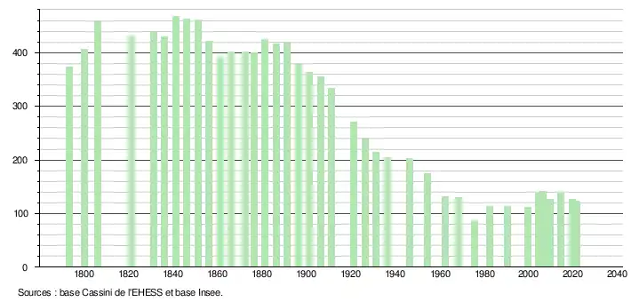L'évolution du nombre d'habitants est connue à travers les recensements de la population effectués dans la commune depuis 1793. Pour les communes de moins de 10 000 habitants, une enquête de recensement portant sur toute la population est réalisée tous les cinq ans, les populations légales des années intermédiaires étant quant à elles estimées par interpolation ou extrapolation[29]. Pour la commune, le premier recensement exhaustif entrant dans le cadre du nouveau dispositif a été réalisé en 2004[30].