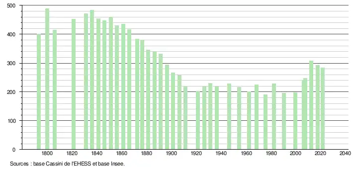 L'évolution du nombre d'habitants est connue à travers les recensements de la population effectués dans la commune depuis 1793. Pour les communes de moins de 10 000 habitants, une enquête de recensement portant sur toute la population est réalisée tous les cinq ans, les populations légales des années intermédiaires étant quant à elles estimées par interpolation ou extrapolation[17]. Pour la commune, le premier recensement exhaustif entrant dans le cadre du nouveau dispositif a été réalisé en 2007[18].