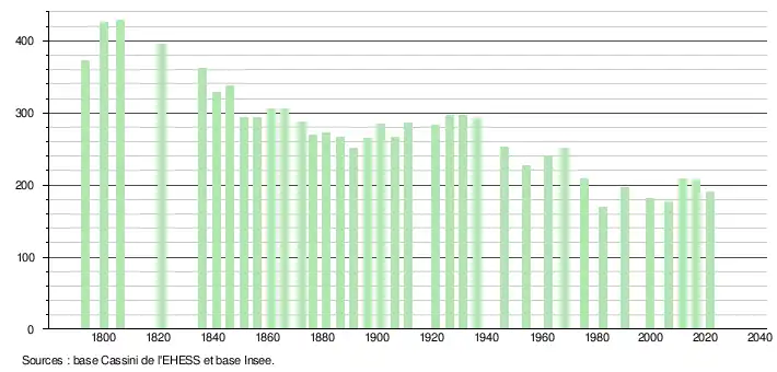 L'évolution du nombre d'habitants est connue à travers les recensements de la population effectués dans la commune depuis 1793. Pour les communes de moins de 10 000 habitants, une enquête de recensement portant sur toute la population est réalisée tous les cinq ans, les populations légales des années intermédiaires étant quant à elles estimées par interpolation ou extrapolation[20]. Pour la commune, le premier recensement exhaustif entrant dans le cadre du nouveau dispositif a été réalisé en 2006[21].