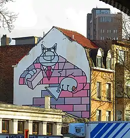 - Deux cases de la plus grande fresque BD du monde due à Philippe Geluck dans le quartier de La Chasse à Etterbeek (Bruxelles, Belgique). Sur plus de 120 m, 24 strips géants embellissent les murs de la caserne Gérizet :