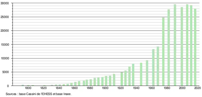 L'évolution du nombre d'habitants est connue à travers les recensements de la population effectués dans la commune depuis 1793. Pour les communes de plus de 10 000 habitants les recensements ont lieu chaque année à la suite d'une enquête par sondage auprès d'un échantillon d'adresses représentant 8 % de leurs logements, contrairement aux autres communes qui ont un recensement réel tous les cinq ans[25],[Note 2].