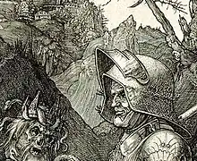 La mort, le diable et le paysage sont tous rendus d'une manière sombre et sont typiques de la Renaissance nordique. Les personnages environnants menacent le chevalier, qui est apparemment protégé par l'armure littérale et figurative de sa foi, l'« armure de Dieu ». Certains historiens de l'art pensent qu'il est lié aux publications en 1502, de l'humaniste et théologien néerlandais Érasme Enchiridion militis christiani[19] : le chevalier peut être vu comme l'archétype du chevalier allemand qui poursuit sa quête sans se laisser distraire par le diable et ignorant calmement la mort. Cette lecture a été reprise par Erwin Panofsky qui contribua à l'imposer[15].