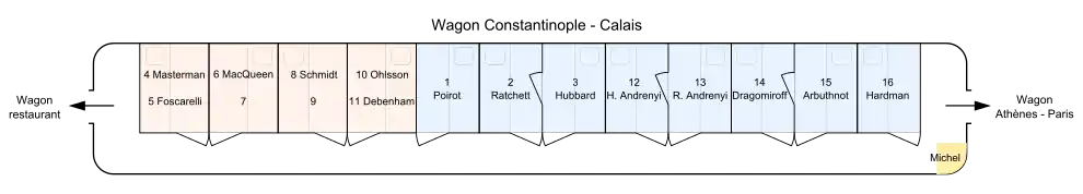- Samuel Ratchett alias Cassetti : antipathique homme d'affaires américain, occupant la couchette no 2 en première classe. Il a un valet de chambre, Henry Masterman, et un secrétaire, M. Macqueen.