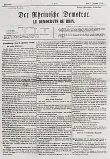 Le nouveau quotidien, dont le premier numéro paraît le 30 décembre 1848, est d'orientation démocrate-socialiste et utilise les dépêches de la Correspondance Paya. Rédigé d'abord intégralement en français, par patriotisme, mais complété par un supplément hebdomadaire en allemand à destination des classes laborieuses des villes et des campagnes (Der Rheinische Demokrat), il deviendra finalement bilingue à partir d'octobre 1849[5].