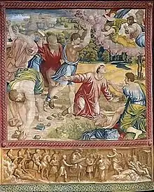 Le bourreau au travail sur la croix correspond notamment au personnage de la tapisserie qui s'efforce de ramasser la pierre qui sera lancée sur le protomartyr[2].