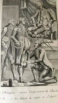 Le Diable dans un bénitier (1784) est un in-octavo de 159 pages d'Anne-Gédéon de La Fitte de Pelleport. Il est orné d’une gravure frontispice satirique : « Le Plénipot… [de Moustier] reçoit l’abjuration de Charlot [Charles Théveneau de Morande] et R…r [Receveur] lui donne la croix de St André. »