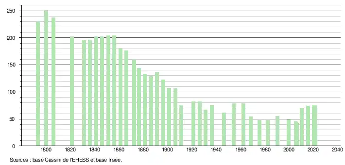 L'évolution du nombre d'habitants est connue à travers les recensements de la population effectués dans la commune depuis 1793. Pour les communes de moins de 10 000 habitants, une enquête de recensement portant sur toute la population est réalisée tous les cinq ans, les populations légales des années intermédiaires étant quant à elles estimées par interpolation ou extrapolation[22]. Pour la commune, le premier recensement exhaustif entrant dans le cadre du nouveau dispositif a été réalisé en 2005[23].