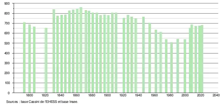 L'évolution du nombre d'habitants est connue à travers les recensements de la population effectués dans la commune depuis 1793. Pour les communes de moins de 10 000 habitants, une enquête de recensement portant sur toute la population est réalisée tous les cinq ans, les populations légales des années intermédiaires étant quant à elles estimées par interpolation ou extrapolation[24]. Pour la commune, le premier recensement exhaustif entrant dans le cadre du nouveau dispositif a été réalisé en 2008[25].