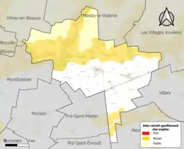La commune est vulnérable au risque de mouvements de terrains constitué principalement du retrait-gonflement des sols argileux[16]. Cet aléa est susceptible d'engendrer des dommages importants aux bâtiments en cas d’alternance de périodes de sécheresse et de pluie. 38,3 % de la superficie communale est en aléa moyen ou fort (52,8 % au niveau départemental et 48,5 % au niveau national). Sur les 321 bâtiments dénombrés sur la commune en 2019, 59 sont en aléa moyen ou fort, soit 18 %, à comparer aux 70 % au niveau départemental et 54 % au niveau national. Une cartographie de l'exposition du territoire national au retrait gonflement des sols argileux est disponible sur le site du BRGM[17],[Carte 2].