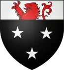 La définition de ces armes est la suivante : Coupé d’argent au lion issant de gueules armé et lampassé d’or, et de sable à trois étoiles d’argent[16].