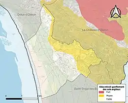 Le retrait-gonflement des sols argileux est susceptible d'engendrer des dommages importants aux bâtiments en cas d’alternance de périodes de sécheresse et de pluie. 28,5 % de la superficie communale est en aléa moyen ou fort (54,2 % au niveau départemental et 48,5 % au niveau national). Sur les 1 229 bâtiments dénombrés sur la commune en 2019, 348 sont en aléa moyen ou fort, soit 28 %, à comparer aux 57 % au niveau départemental et 54 % au niveau national. Une cartographie de l'exposition du territoire national au retrait gonflement des sols argileux est disponible sur le site du BRGM[33],[Carte 2].
