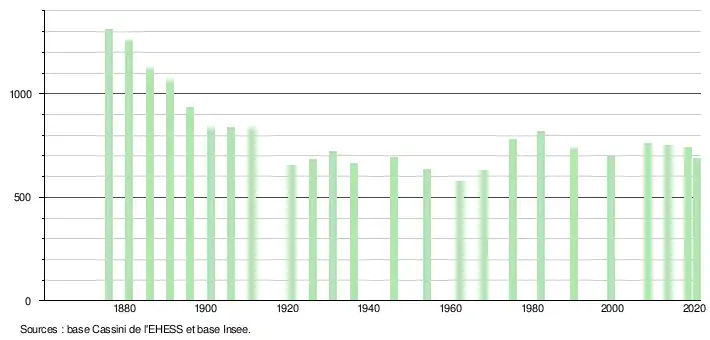 L'évolution du nombre d'habitants est connue à travers les recensements de la population effectués dans la commune depuis 1876. À partir du , les populations légales des communes sont publiées annuellement dans le cadre d'un recensement qui repose désormais sur une collecte d'information annuelle, concernant successivement tous les territoires communaux au cours d'une période de cinq ans. Pour les communes de moins de 10 000 habitants, une enquête de recensement portant sur toute la population est réalisée tous les cinq ans, les populations légales des années intermédiaires étant quant à elles estimées par interpolation ou extrapolation[9]. Pour la commune, le premier recensement exhaustif entrant dans le cadre du nouveau dispositif a été réalisé en 2008[10],[Note 2].
