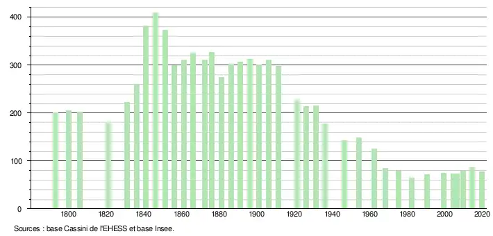| L'évolution du nombre d'habitants est connue à travers les recensements de la population effectués dans la commune depuis 1793. Pour les communes de moins de 10 000 habitants, une enquête de recensement portant sur toute la population est réalisée tous les cinq ans, les populations légales des années intermédiaires étant quant à elles estimées par interpolation ou extrapolation[23]. Pour la commune, le premier recensement exhaustif entrant dans le cadre du nouveau dispositif a été réalisé en 2004[24]. En 2019, la commune comptait 77 habitants[Note 7], en diminution de 9,41 % par rapport à 2013 (Corrèze : −0,86 %, France hors Mayotte : +1,84 %). |