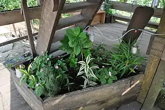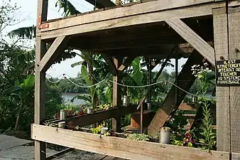 Le jardin botanique, situé dans le périmètre de la structure en bois, accueille des fleurs, des plantes cosmétiques, des épices et des plantes thérapeutiques. Le Jardin sonore est équipé d'un système d'irrigation durable par « goutte à goutte », qui permet d'atteindre une autonomie en eau allant jusqu'à six mois. L'eau de pluie est collectée, stockée dans des barils puis distribuée via des tubes transparents au jardin vertical en utilisant un système de goutte à goutte hydroponique. Ce système permet de ne pas perdre d'eau et, en même temps, ne nécessite pas un arrosage régulier de la part des habitants. Les gouttes d'eau tombent dans des boîtes de tailles différentes, créant des notes et nourrissant les plantes pour les habitants de Bonamouti. Différents sons sortent du jardin, ils sont directement liés aux besoins en eau des plantes. Ce jardin suspendu pousse au son de l'eau et invite le public à contempler le fleuve Wouri de chacun de ses trois niveaux.