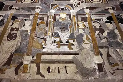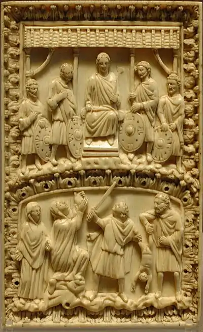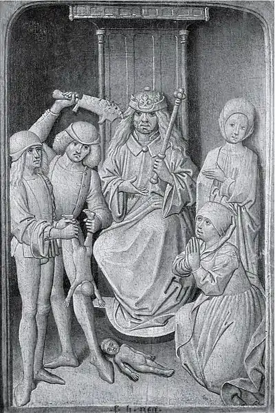 - Éléments constitutifs d'un jugement de Salomon : Salomon surélevé sur son trône, les deux mères, un soldat tenant un enfant vivant, un enfant mort déposé sur le sol et des courtisans.