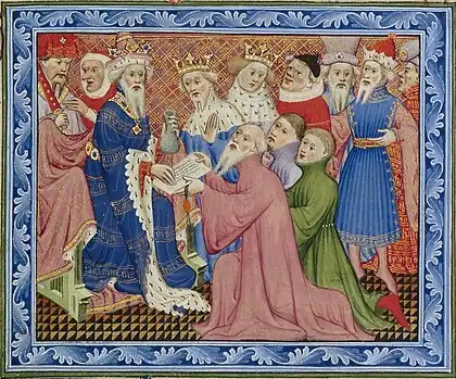 - Plusieurs de ces manuscrits sont pourvus d'instruments d'authentification : un certificat d'origine contenant une dédicace « pour honneur et révérence à puissant seigneur[n 6] », et des cachets royaux[13].