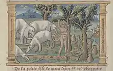 Une page d'un manuscrit du Livre de Marco Polo racontant la bataille contre les éléphants du roi de Birmanie (ms. A2, BnF fr. 2810, en ligne). | |