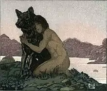 Couverture de l'édition originale (MacMillan) du The Jungle Book de 1894, illustrée par John Lockwood Kipling, le père de Rudyard | |