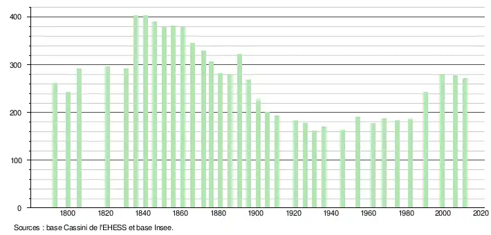 L'évolution du nombre d'habitants est connue à travers les recensements de la population effectués dans la commune depuis 1793. À partir du , les populations légales des communes sont publiées annuellement dans le cadre d'un recensement qui repose désormais sur une collecte d'information annuelle, concernant successivement tous les territoires communaux au cours d'une période de cinq ans. Pour les communes de moins de 10 000 habitants, une enquête de recensement portant sur toute la population est réalisée tous les cinq ans, les populations légales des années intermédiaires étant quant à elles estimées par interpolation ou extrapolation[13]. Pour la commune, le premier recensement exhaustif entrant dans le cadre du nouveau dispositif a été réalisé en 2006[14],[Note 2].