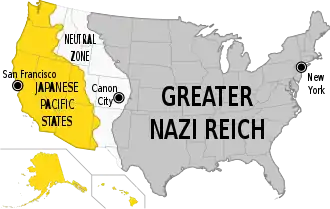 En , les États-Unis ont finalement capitulé face à l'empire du Japon et au Troisième Reich, près de deux ans après le largage par ces derniers d'une bombe A sur Washington D.C. en décembre 1945. Le territoire américain est alors divisé en trois espaces distincts :