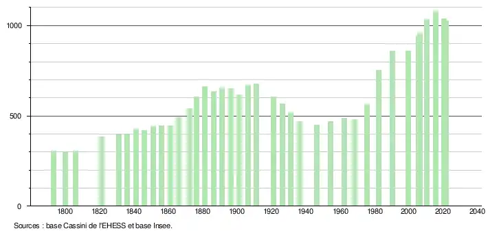 L'évolution du nombre d'habitants est connue à travers les recensements de la population effectués dans la commune depuis 1793. Pour les communes de moins de 10 000 habitants, une enquête de recensement portant sur toute la population est réalisée tous les cinq ans, les populations légales des années intermédiaires étant quant à elles estimées par interpolation ou extrapolation[31]. Pour la commune, le premier recensement exhaustif entrant dans le cadre du nouveau dispositif a été réalisé en 2005[32].