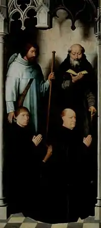 Comme déjà dit plus haut, les revers des deux volets sont exceptionnellement élaborés. Ils représentent deux alcôves dans lesquelles se tiennent les deux donateurs (à gauche) et les deux donatrices (à droite) priant à genoux, accompagnés chacun de son saint patron. Sur le volet gauche, les frères Anthonis Seghers et Jacob de Kueninc sont accompagnés par saint Jacques le Majeur et saint Antoine abbé ; alors que sur le volet droit les sœurs Agnès de Casembrood et Clara van Hülsen sont accompagnées par leurs saintes patronnes sainte Agnès et sainte Claire[2],[3]. L'éclairage des alcôves leur donne une profondeur qui fait ressembler les saints à un ensemble de statues. Selon une méthode que Memling apprécie, les deux donatrices (et moins pour les donateurs) sont peintes devant les alcôves; cela se voit sur la colonne gauche du volet droit.