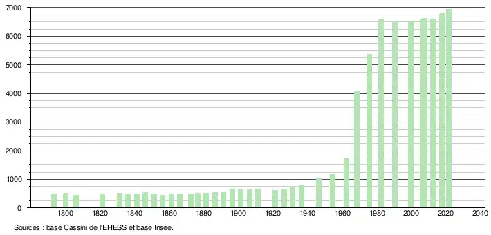 L'évolution du nombre d'habitants est connue à travers les recensements de la population effectués dans la commune depuis 1793. Pour les communes de moins de 10 000 habitants, une enquête de recensement portant sur toute la population est réalisée tous les cinq ans, les populations légales des années intermédiaires étant quant à elles estimées par interpolation ou extrapolation[21]. Pour la commune, le premier recensement exhaustif entrant dans le cadre du nouveau dispositif a été réalisé en 2007[22].
