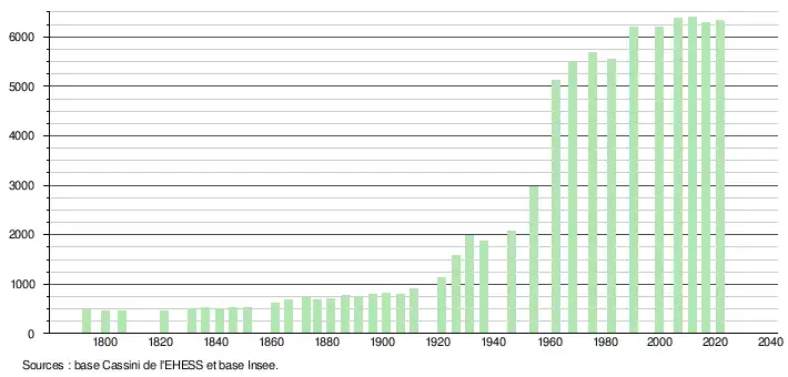 L'évolution du nombre d'habitants est connue à travers les recensements de la population effectués dans la commune depuis 1793. Pour les communes de moins de 10 000 habitants, une enquête de recensement portant sur toute la population est réalisée tous les cinq ans, les populations légales des années intermédiaires étant quant à elles estimées par interpolation ou extrapolation[32]. Pour la commune, le premier recensement exhaustif entrant dans le cadre du nouveau dispositif a été réalisé en 2006[33].