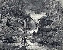 Une lande déserte, s’étendant jusqu’à la mer. Au fond, un ravin, dont un arbre renversé joint les deux bords.