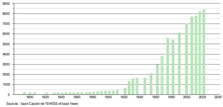 L'évolution du nombre d'habitants est connue à travers les recensements de la population effectués dans la commune depuis 1793. Pour les communes de moins de 10 000 habitants, une enquête de recensement portant sur toute la population est réalisée tous les cinq ans, les populations légales des années intermédiaires étant quant à elles estimées par interpolation ou extrapolation[29]. Pour la commune, le premier recensement exhaustif entrant dans le cadre du nouveau dispositif a été réalisé en 2006[30].