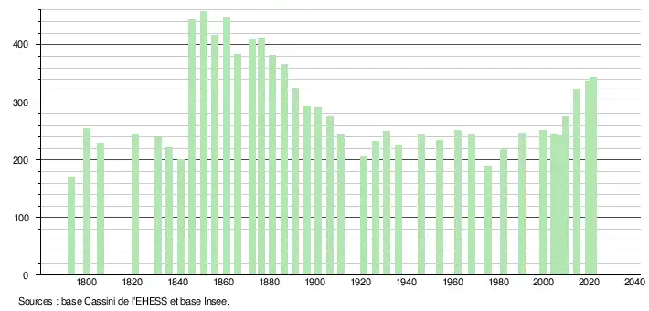 L'évolution du nombre d'habitants est connue à travers les recensements de la population effectués dans la commune depuis 1793. Pour les communes de moins de 10 000 habitants, une enquête de recensement portant sur toute la population est réalisée tous les cinq ans, les populations légales des années intermédiaires étant quant à elles estimées par interpolation ou extrapolation[25]. Pour la commune, le premier recensement exhaustif entrant dans le cadre du nouveau dispositif a été réalisé en 2004[26].